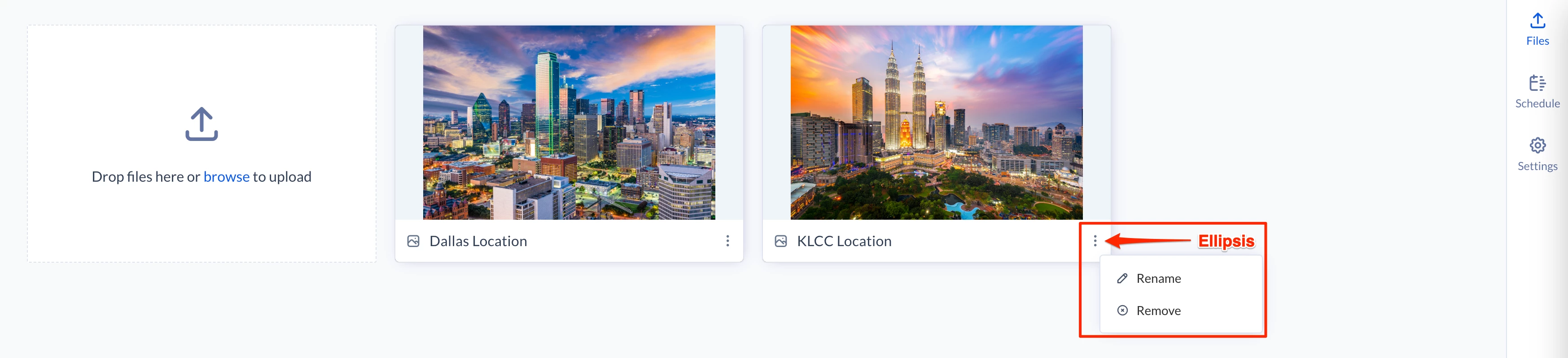 If multiple media content files are uploaded, you may Rename or Remove media content files by clicking the ellipsis of the selected content.
