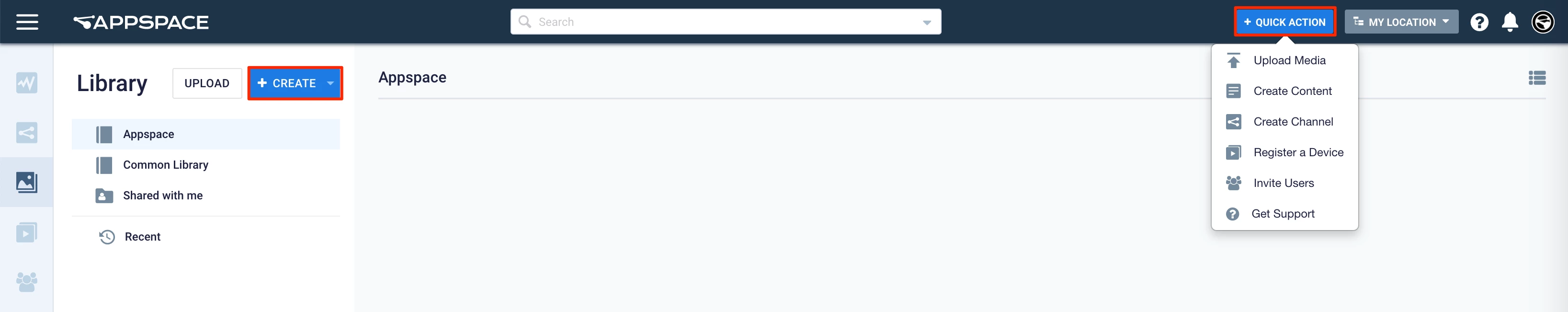 - Click +QUICK ACTION from the Appspace menu bar on the top right, and select Create Content.