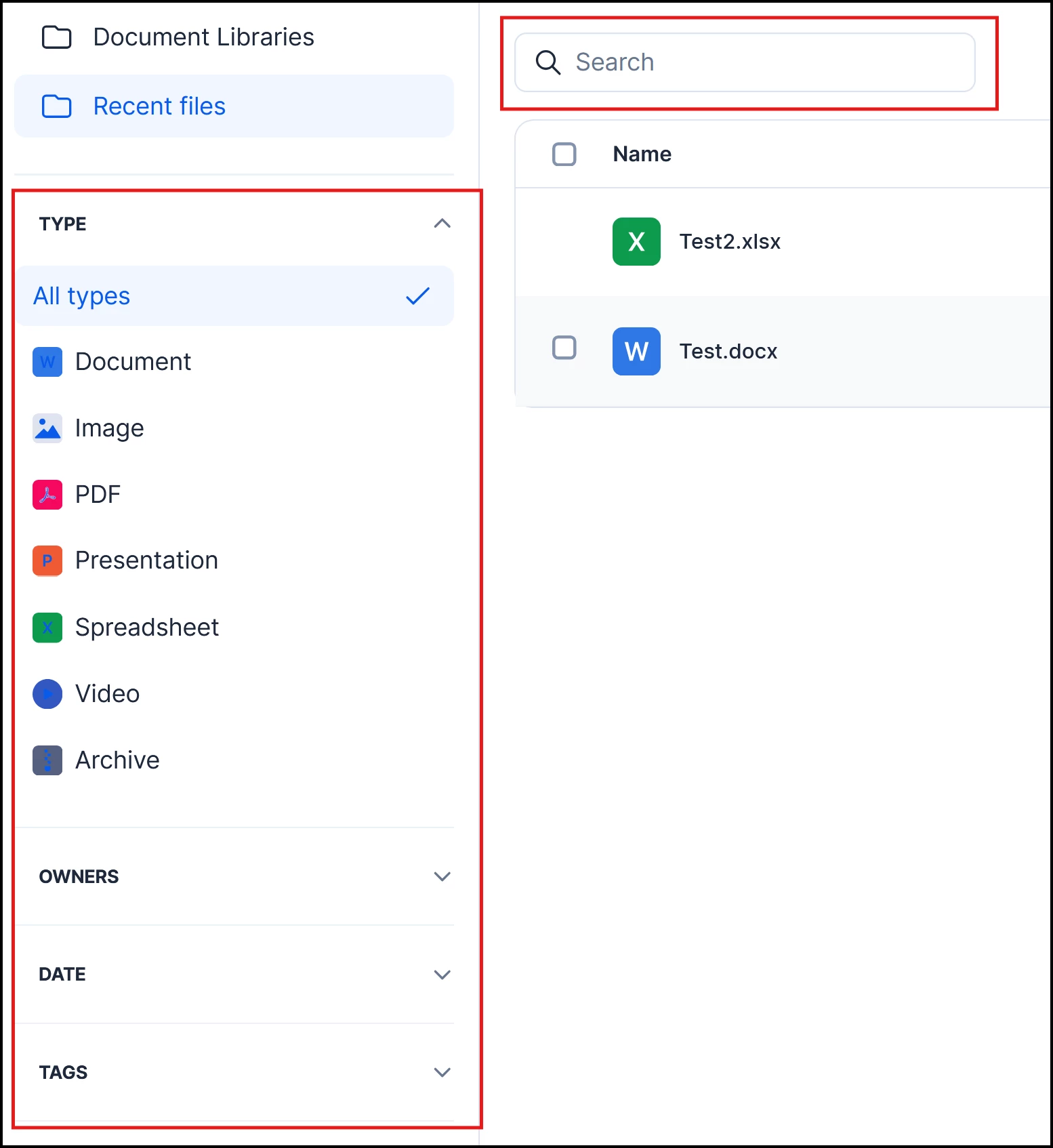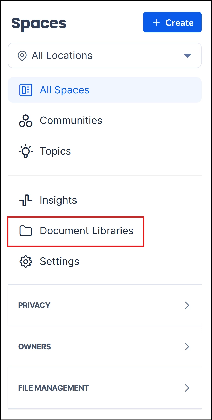 - On the navigation menu, go to Spaces and select Document Libraries. All files across the platform are displayed in the unified file library.