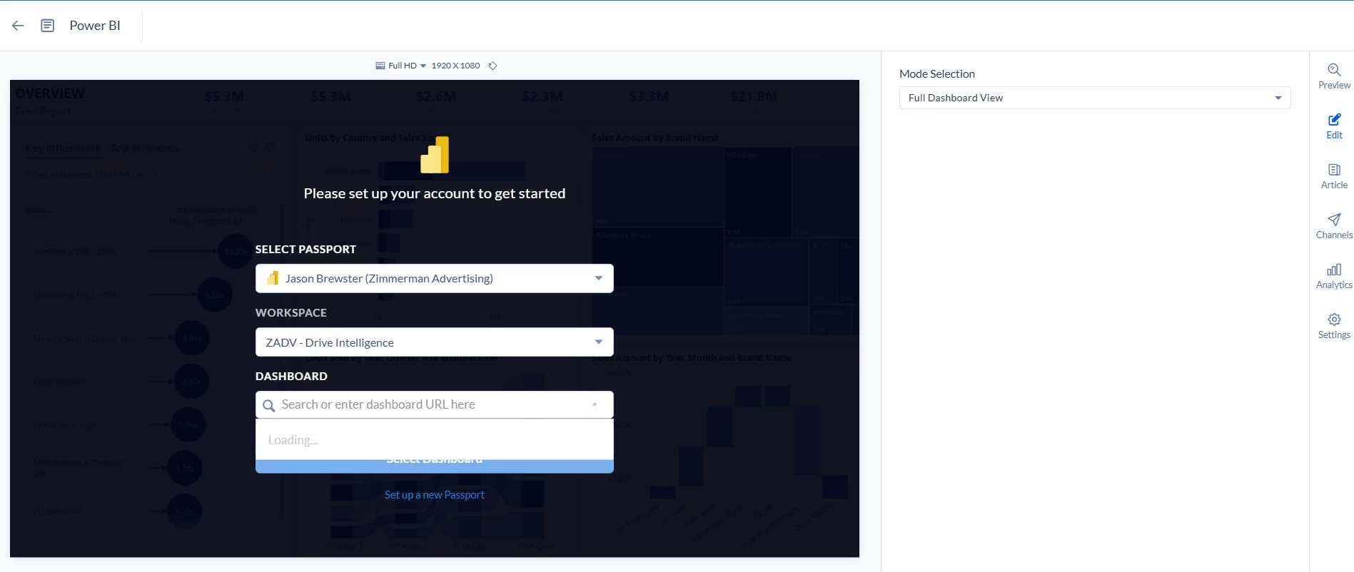 The Dashboard selector is stuck at the loading step and never populates the dashboards despite the fact that I am an admin for PBI and was able to make the passport connection.