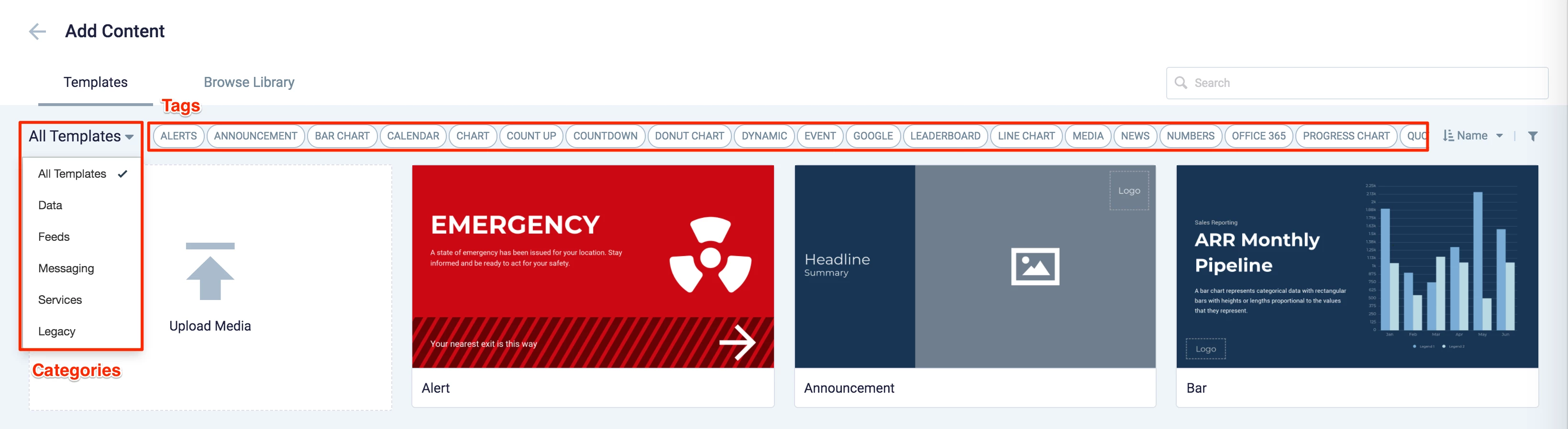 When creating a card, you now have the option to filter results based on tags and card template categories which are based on card types such as Messaging, Data, Services, Feeds, and Legacy content – to easily find what you need from a huge list of templates available.