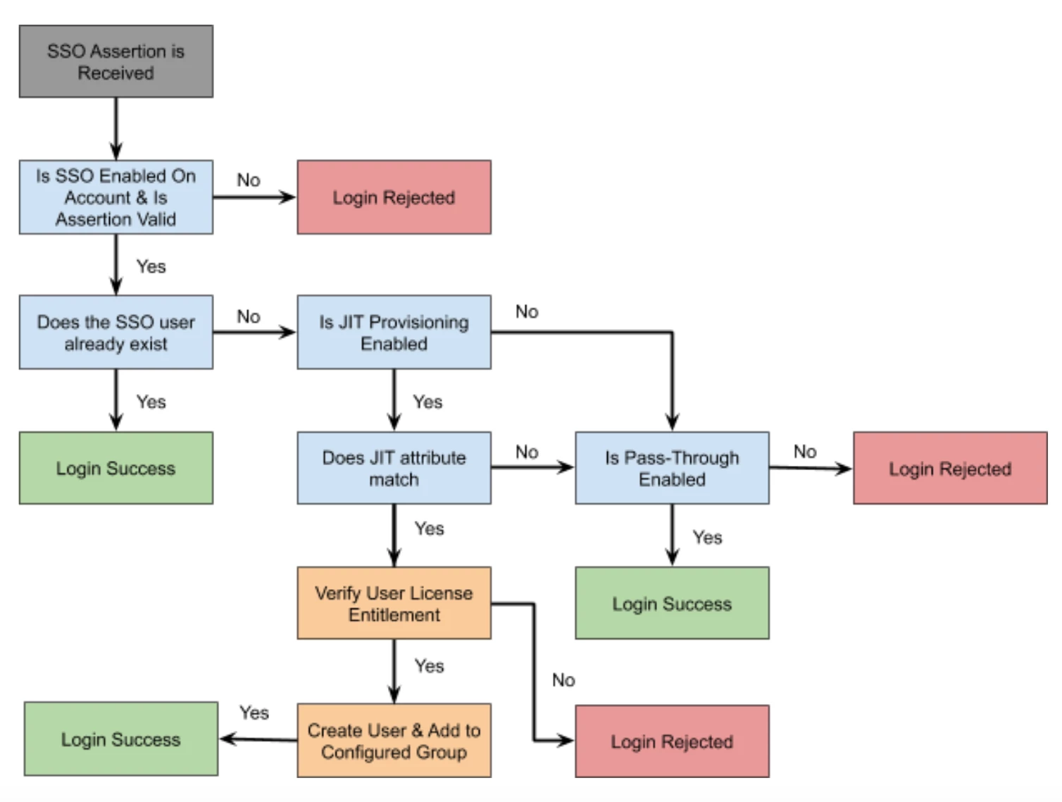 - SSO with pass-through authentication is enabled, but JIT provisioning is not enabled.