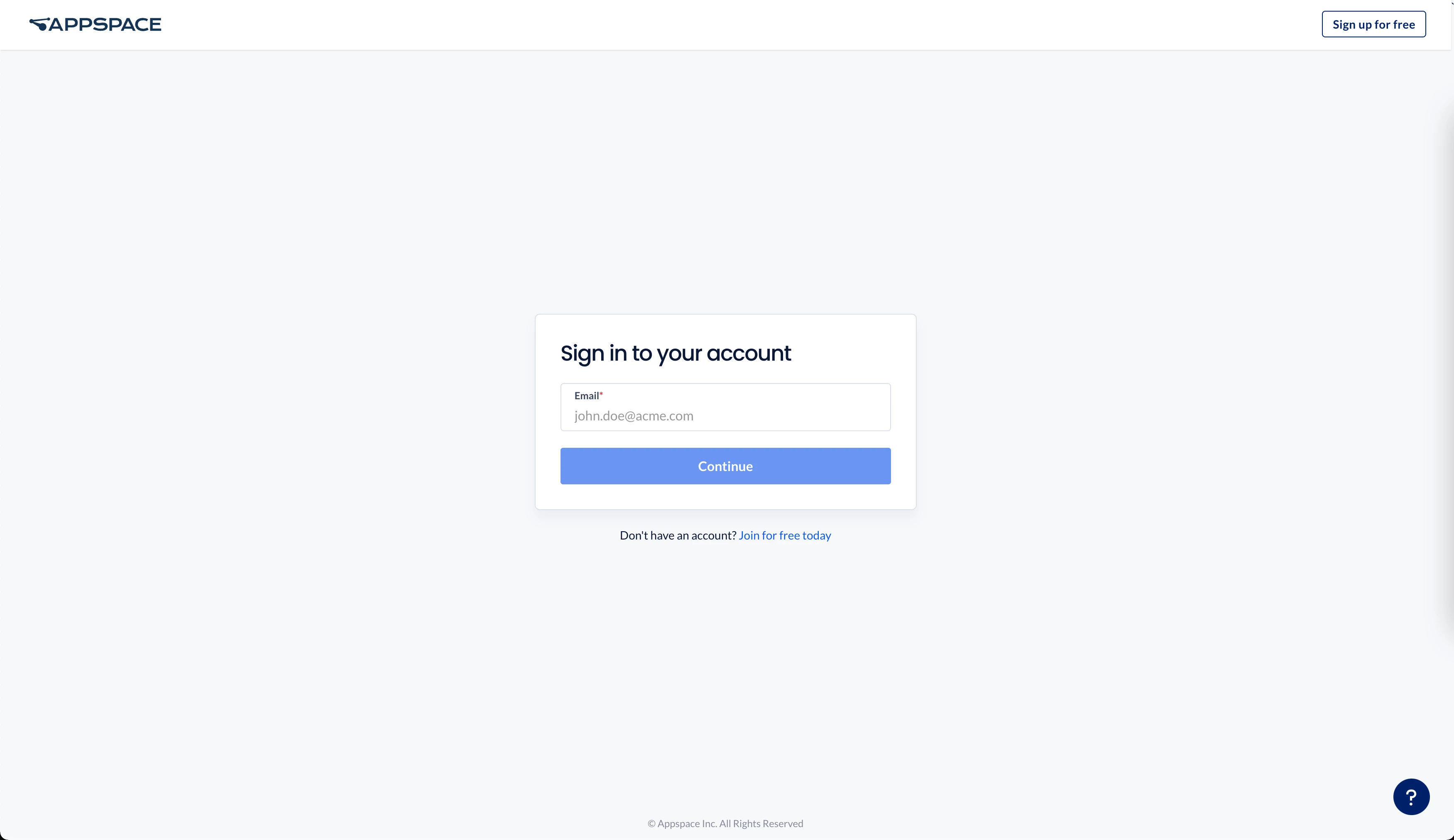 - On the login screen, enter your email address that is used to access the Appspace platform, and click Continue.