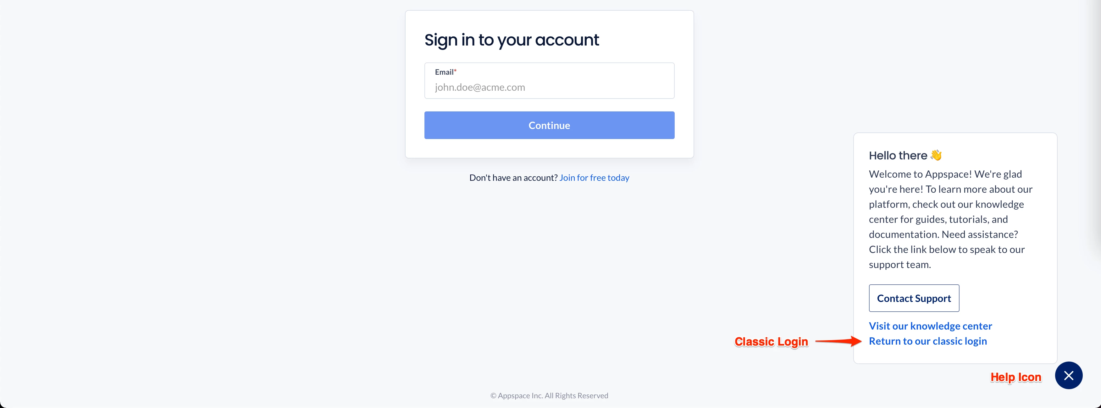 - At the login screen, click the Help icon, and click the Return to our classic login link. (Link: https://cloud.appspace.com/#!/login?uselegacy=true)