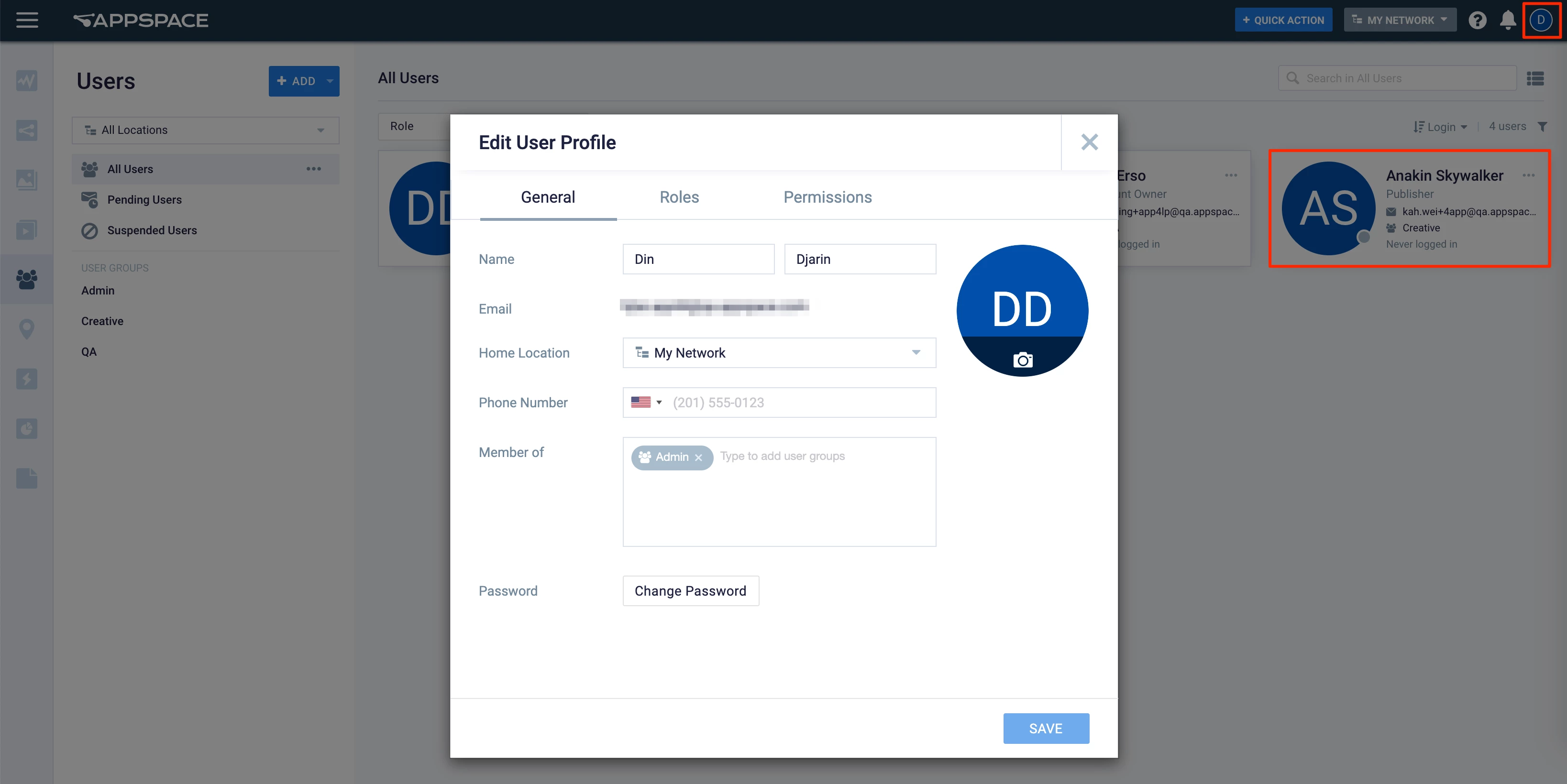 If you have an Appspace account with any administrator role, you may edit and update your own user profile.