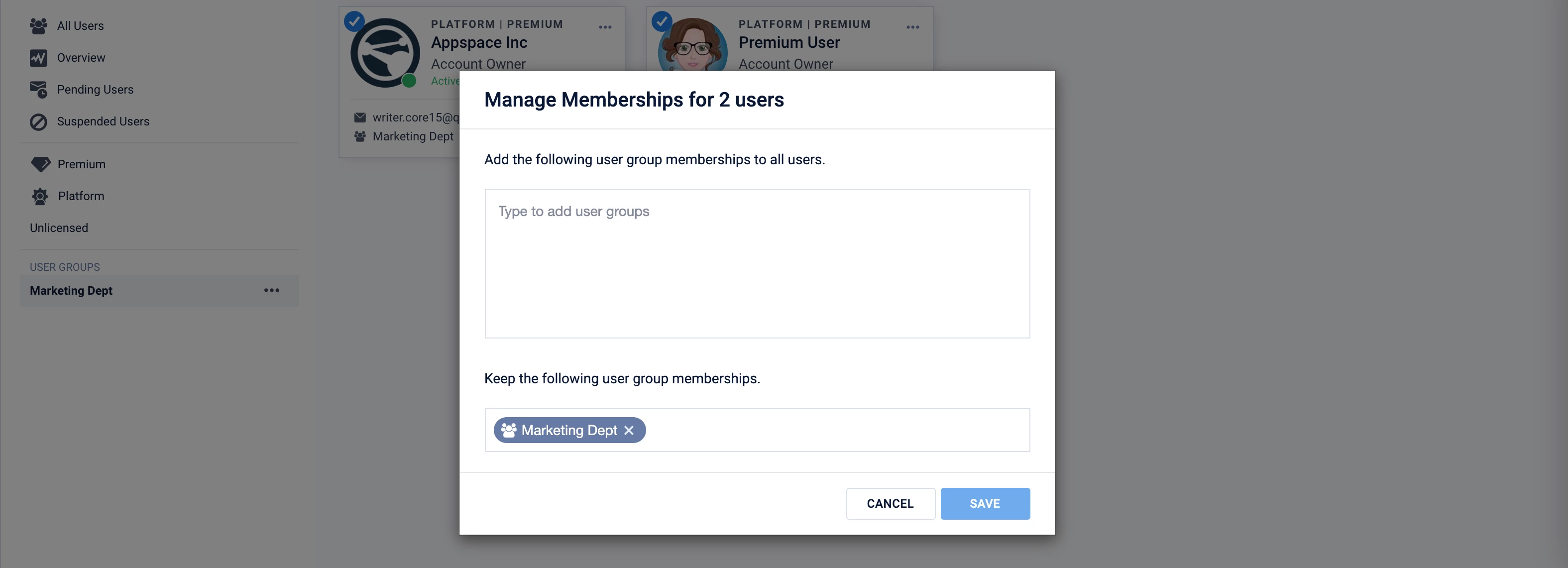 - Alternatively, you may remove the membership for the selected users by deleting the User Group listed.