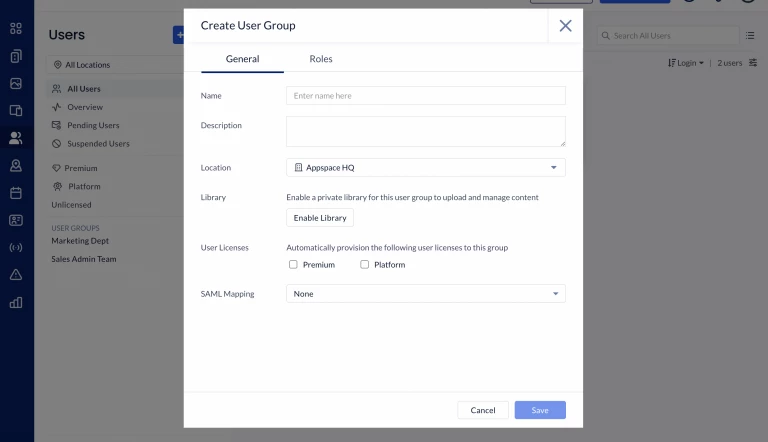 User groups are created to easily manage users in terms of assigning locations, roles, or channel permissions. Each user group may enable a library, allowing only users assigned to the user group to access, upload, and manage content in that library. However, all Account Owners will still have access to the library regardless if they have been assigned to the user group or not.