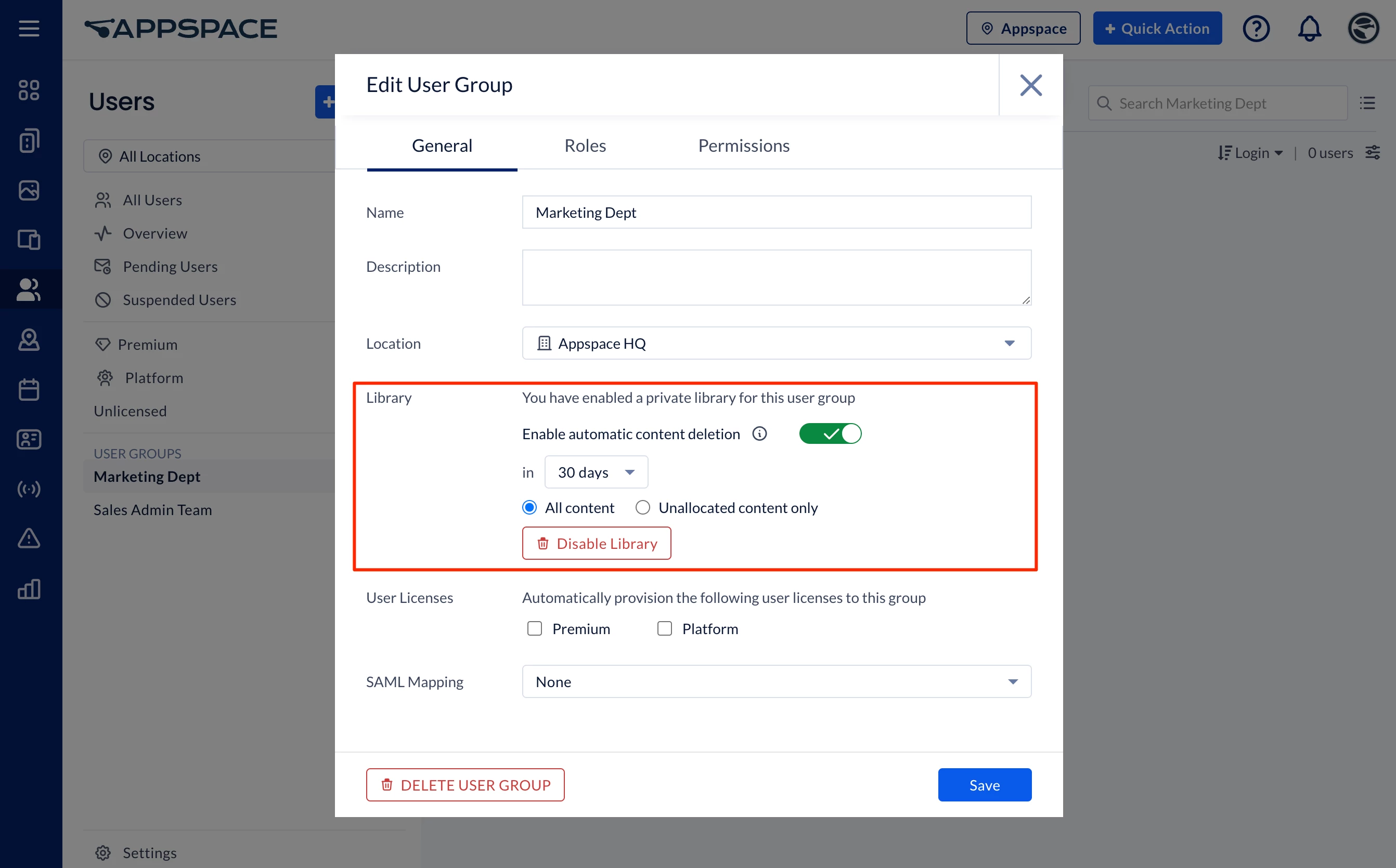 - Optionally, you may enable the user group library by clicking the Enable Library button. Once enabled, you may also Enable automatic content deletion: