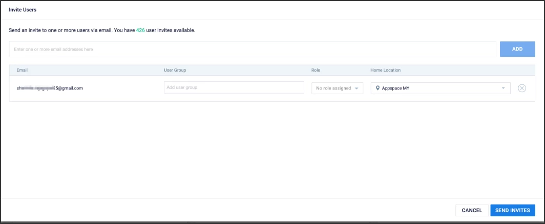 - In the Invite Users window, enter the user’s email address, and click ADD. You may enter multiple email addresses to the field at once.