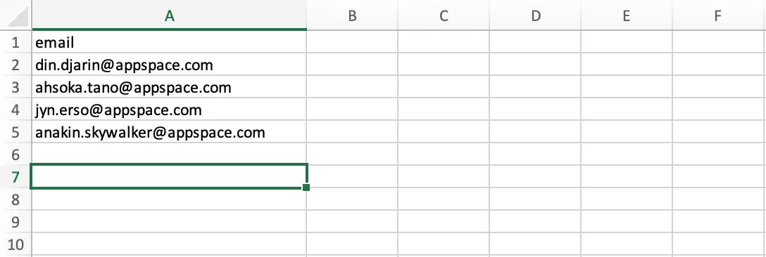 - Subsequent rows of the first column contain the users’ email addresses, with each row containing one email address.