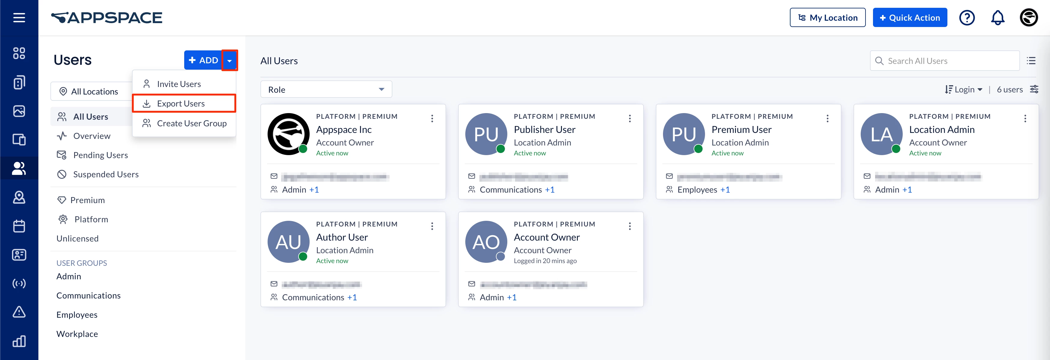 The Users module in the Appspace console is the primary user account management center that allows administrators to send user invitations, manage users and user groups, and also assign user roles and permissions for navigating features in the console. Appspace 8.0 introduces a brand new user interface with a streamlined design, improved functionality, and updated workflows for a better user experience.