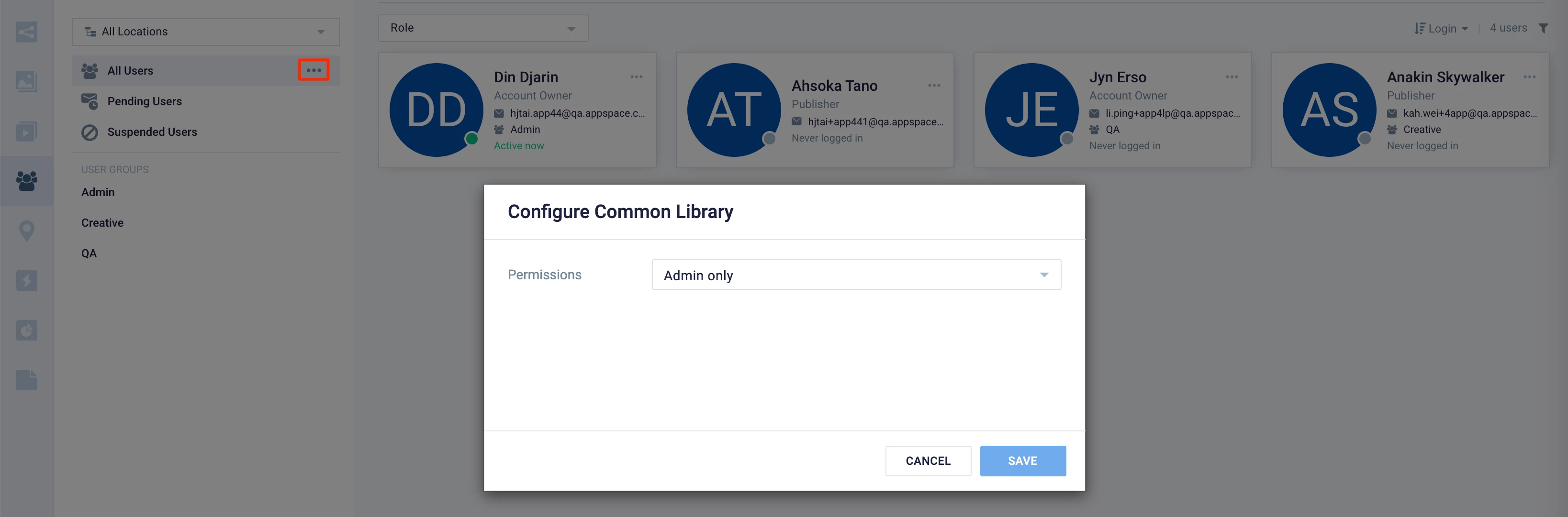 An Account Owner may create one common library for all users under their account, by clicking the All Users ellipsis on the Users dashboard, and selecting Configure Common Library. The Account Owner may configure read, write, or custom permissions providing users or user groups with access to view or manage content together within the common library.