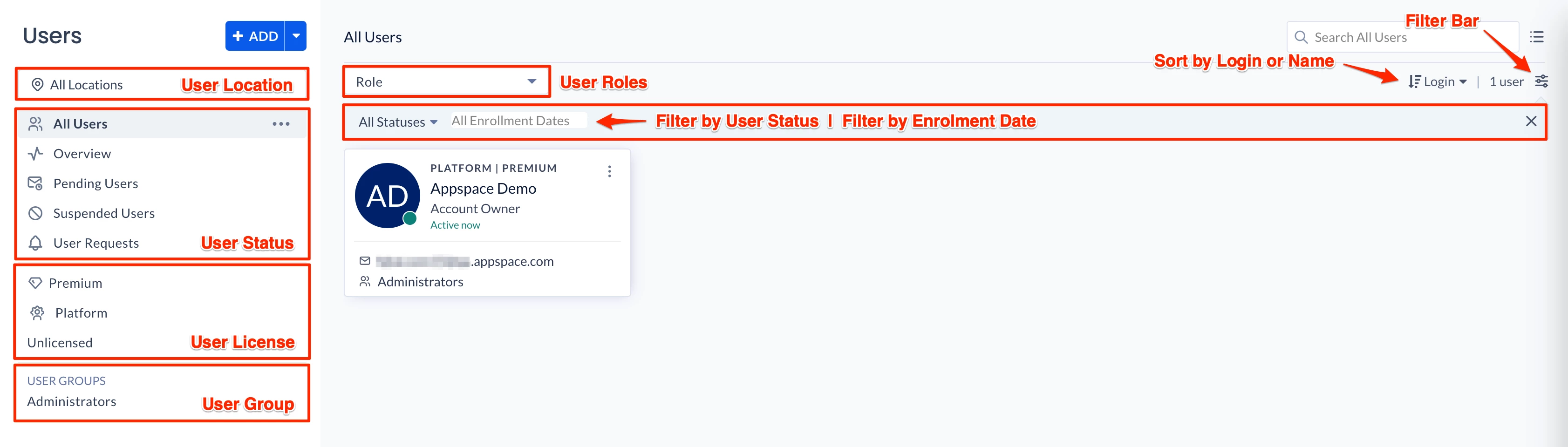 - The user navigation tree displays all users invited into the Appspace platform. You can choose to view: