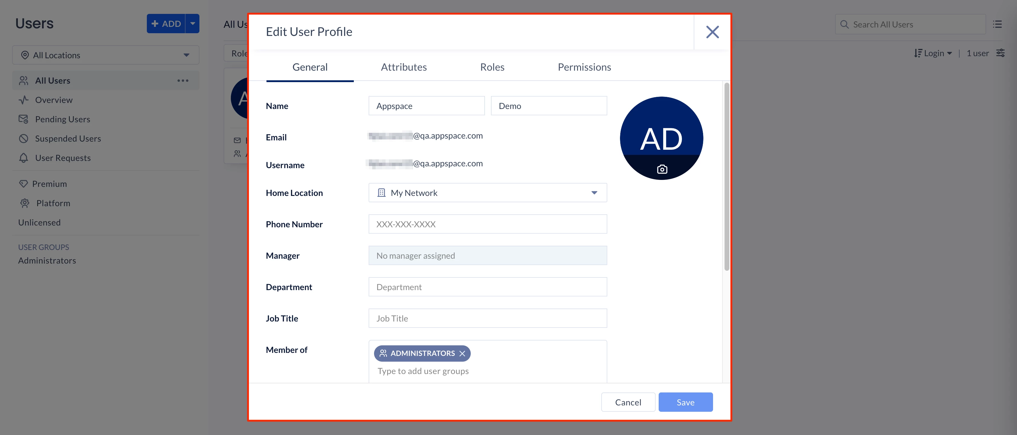 With the latest SAML enhancement introduced in Appspace 8.1 ac.19, the Attributes tab displays all the user’s attributes that are linked from the external IdP source. This tab is only available for SSO users that have been provisioned via the Just-In-Time provisioning feature, with SAML attributes configured.