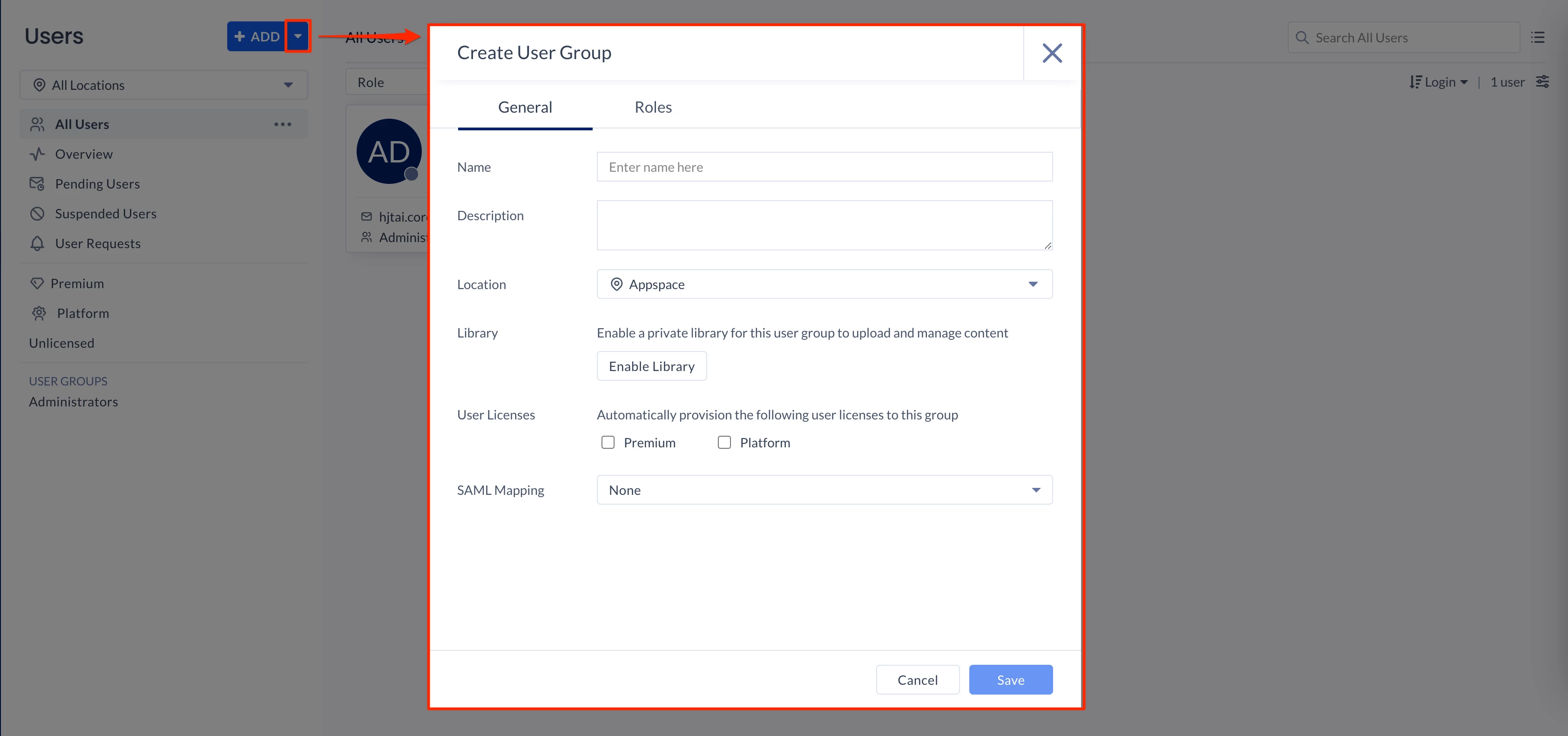 User groups are ideal for grouping users according to function, project, or locations, when you have a large number of users in the organization. You can perform bulk operations to a user group such as assigning locations, roles, or channel permissions, and all users in the group will inherit the permissions. Administrators can enable a single shared library for each user group, and configure read, write, or only view, permissions allowing users assigned to the user group to view and manage content together.