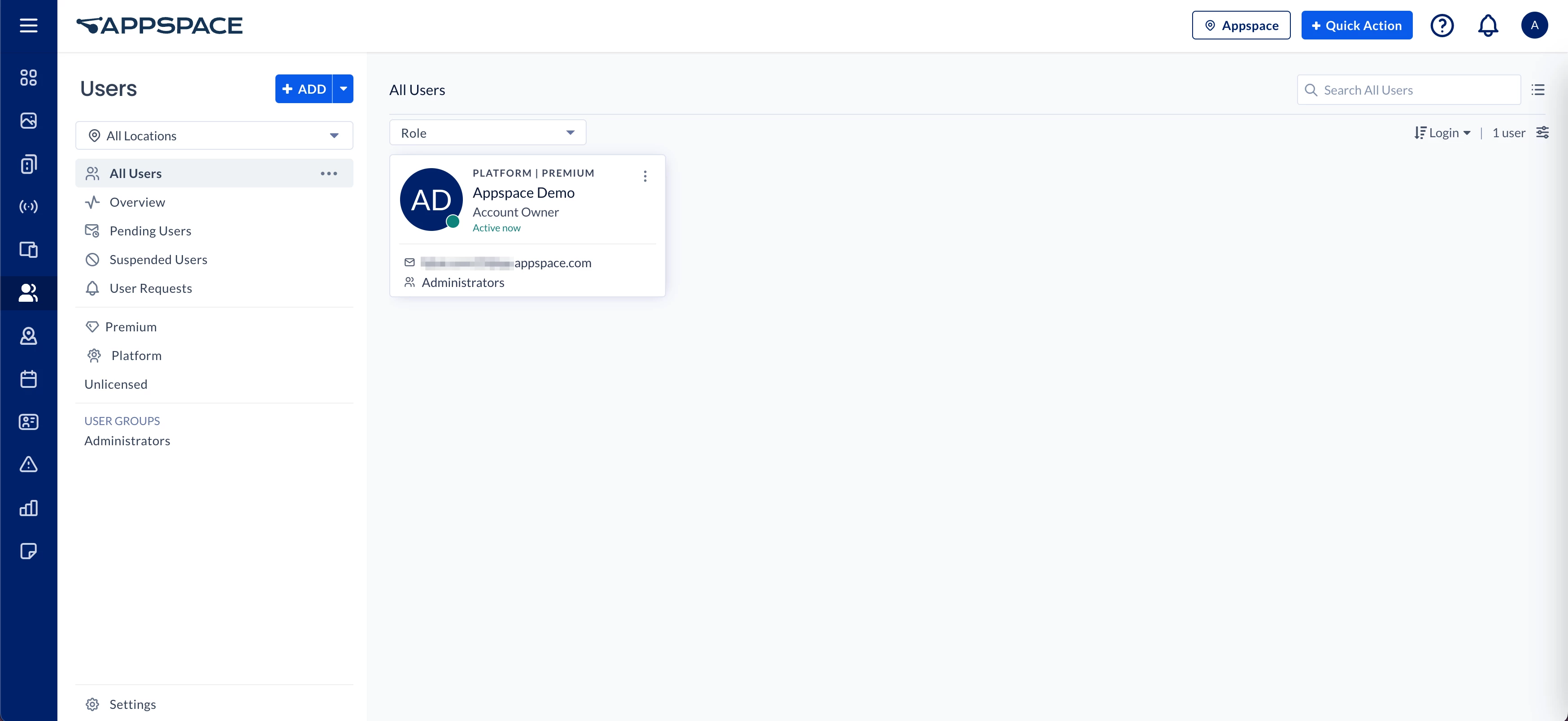 - Platform – Users that have been assigned with the Platform License, and have access to the Appspace console.