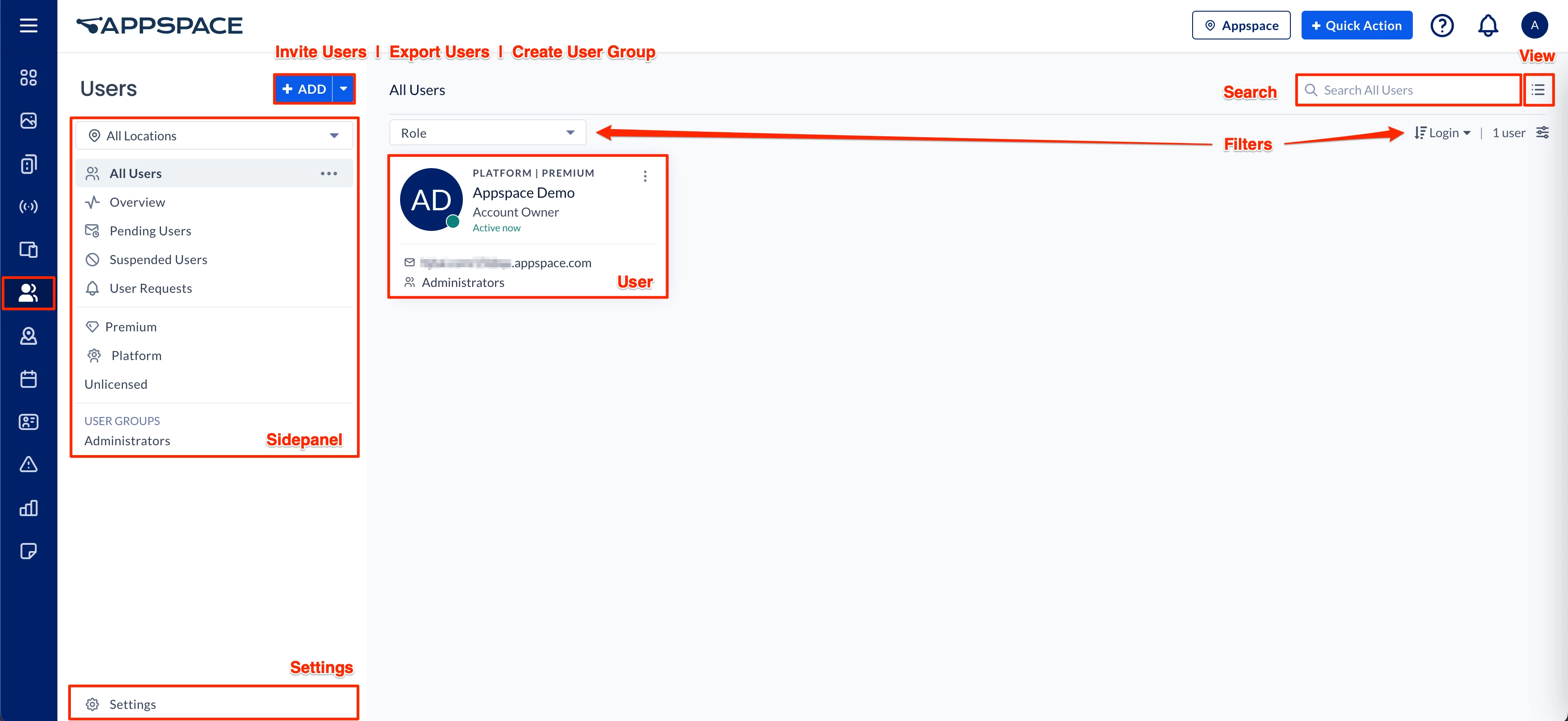 - The Users dashboard is accessed via the ☰ Appspace menu on the console sidebar. Here, you’ll be able to view, invite, and manage users within the Admin console. All invited users and user accounts are displayed on the dashboard, listing important user details at a glance, such as: