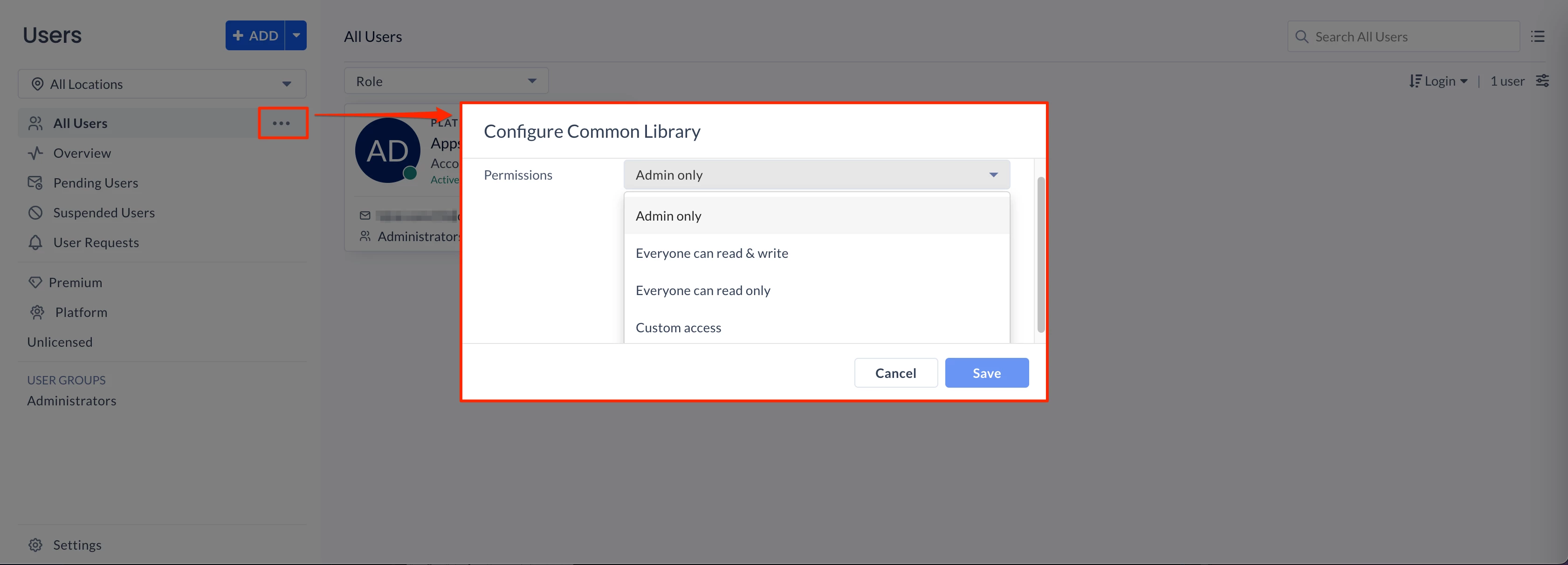 An Account Owner may create one common library for all users under his account, by clicking the All Users ellipsis on the Users dashboard and selecting Configure Common Library. The Account Owner can configure read, write, or only view, permissions allowing users to view and manage content together in the common library.